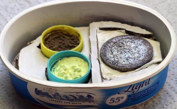 L’esperimento prevede di rinchiudere in ambiente quasi sigillato (confezione di plastica di un noto formaggio spalmabile magro) la moneta, poggiata su tessuto o carta assorbente, e due tappi da acqua minerale rovesciati contenti uno Zolfo bagnabile 80% e l’altro Zolfo ventilato, entrambi prodotti che si usano in agricoltura per la lotta allo oidio. Non ho messo al sole il tutto, ma riposa in ombra su uno scaffale, e presto girerò la moneta.
