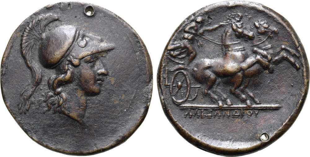 ANCIENT GREEK, Kings of Macedon. Alexander III. 336-323 BC. Æ Medal (37mm, 30.02 g, 10h). Later cast in the style of the Giovanni Cavino school. AΛEΞANΔPOΣ, head of Athena left, wearing corinthian helmet decorated with Skylla (?); cap behind / Alexander riding quadriga of elephants right; triumphal arch to right; in exergue, ΓEPΣIΣAΛΩOCIΣA. Johnson & Martini 1212-20. Good Fine, holed.