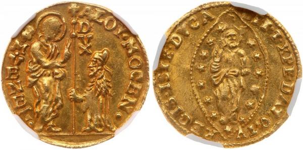 Zecchino, AV 3,49 g. ALOY MOCEN – S M VENET S. Marco, stante a s., porge il vessillo al Doge genuflesso; lungo l’asta, D V X. Rv. SIT T XPE DAT Q TV – REGIS ISTE DVCA Il Redentore, benedicente, stante di fronte entro aureola ellittica. CNI 123. Papadopoli 4. Friedberg 1421.