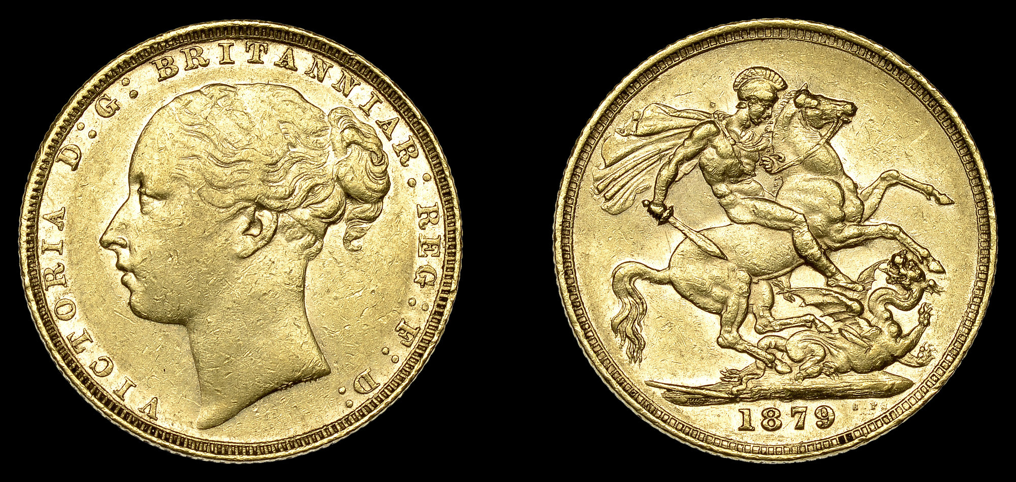 Non si legge bene il segno di zecca ma mi pare proprio un esemplare di Melbourne. La moneta risulta comune ed ha svolto il proprio lavoro attraverso varie epoche, accomodandosi in molte tasche e viaggiando attraverso molti parelleli e meridiani. Il suo valore, ora come allora, risulta il fino aureo contenuto ma il suo fascino non è certo comparabile a quello di un lingotto. Ad inizio discussione ne presentai una in simili condizioni e ne analizzammo lo stato di conservazione. A distanza di tempo mi sono reso conto che trovare monete di questa tipologia ma della zecca di Londra non è molto facile neanche per i millesimi considerati comuni. In mano non ne ho mai viste in Ef.