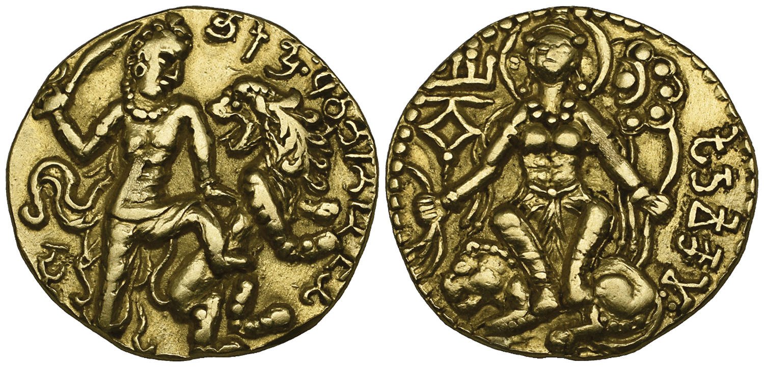 India, Gupta Dynasty, Chandragupta II (c. 380-414), gold dinar, lion-trampler type, king standing right, raising sword and trampling on lion which turns to snap back at him, rev., Lakshmi, nimbate, seated facing on crouching lion, 7.98g, die axis 12.00 (BMC pl. IX, 13 – in Lucknow Museum)), good very fine and extremely rare. The Sanskrit inscription on the obverse can be read as "The moon among kings who is famous for his warfare, who is invincible, and who is valorous like a lion, is victorious on the battlefield" and on the reverse "having the valour of the lion". The type is extremely rare and was missing from the famous Bayana hoard of 1946.   (3000-5000 GBP)