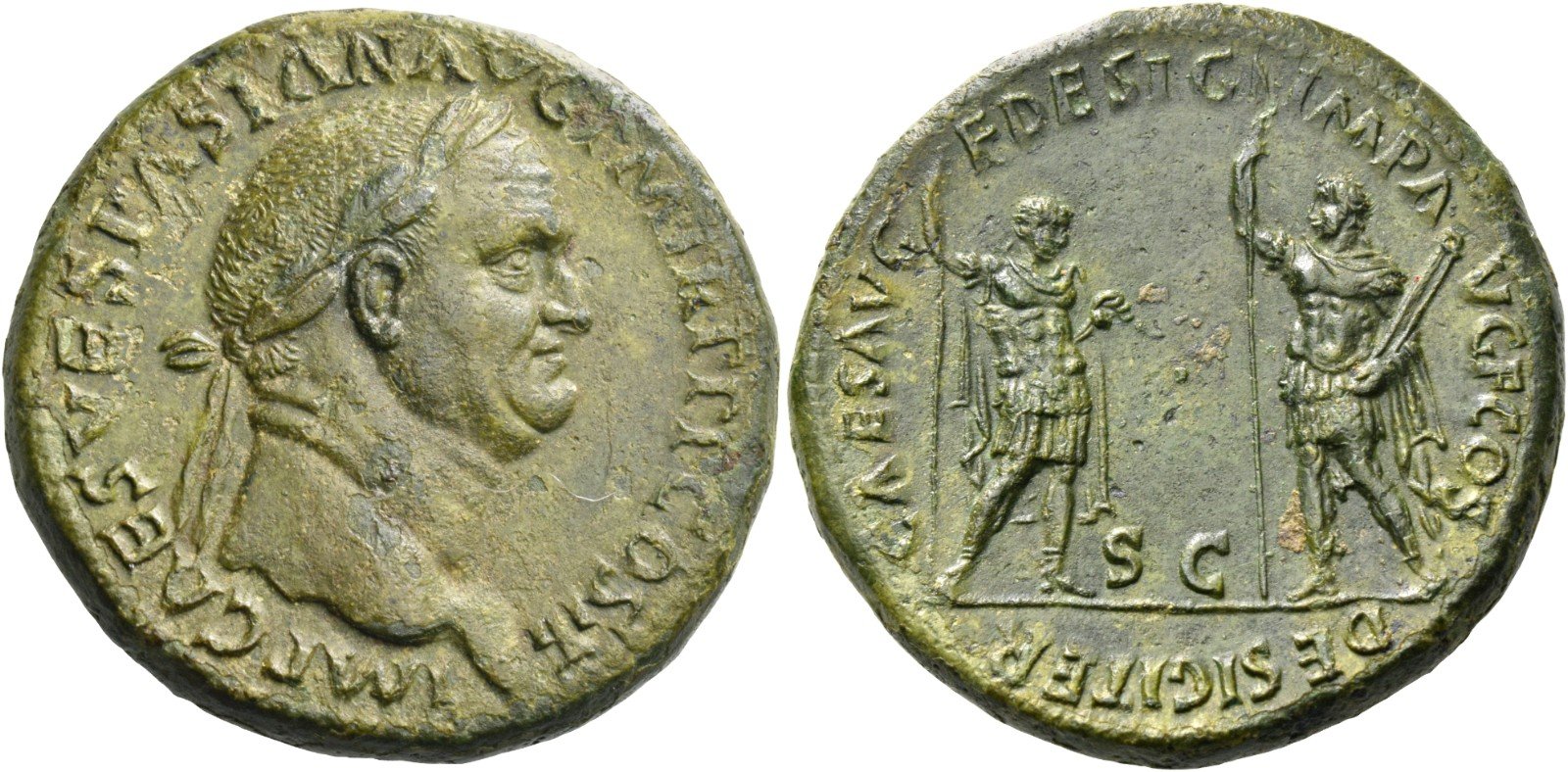 Vespasian, 69 – 79. Sestertius 71, Æ 25.10 g. IMP CAES VESPASIAN AVG P M TR P P P COS II Laureate head r. Rev. CAES AVG – F DESIG IMP AVG F COS DESIG – ITER Titus and Domitian, standing l. and r., both holding spears; Titus also holding parazonium and Domitian holding roll. Below, S C. C 50. BMC 798. RIC 154 note 45. CBN 477.