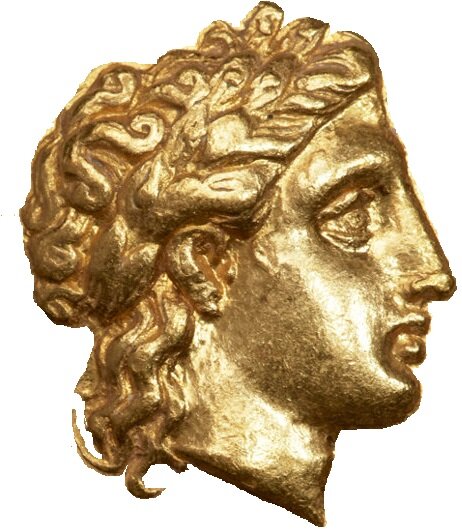 In 373/2 BC, an earthquake destroyed the great Temple of Apollo at Delphi. Although reconstruction on the site commenced, the Phokian occupation of the sanctuary during the Sacred War of 355-346 BC prevented any full-scale work from occurring. In 338/6 BC, the Amphiktionic League decided to melt down the coinage comprising the temple treasury and mint a new series of coinage that would be used to finance a full reconstruction project. This new series comprised staters, drachms, and hemidrachms, whose types reflected the two sanctuaries controlled by the Amphiktionic League: the Temple of Apollo at Delphi and the Temple of Demeter at Anthela (near Thermopylai). The obverse of the staters depicts a left-facing head of Demeter, wearing a veil and grain-ear wreath in her traditional guise as the goddess of grain and fertility. On the reverse, Apollo is seated in a contemplative manner on an omphalos, holding a laurel branch and resting his elbow on a kithara. The omphalos, kithara, and laurel branch each recall a significant aspect of Apollo’s mythology, with the omphalos signifying his oracular seat at Delphi, the kithara his dominion over music, and the laurel (ἡ δάφνη) his personal badge, the result of his unrequited love for the nymph Daphne.