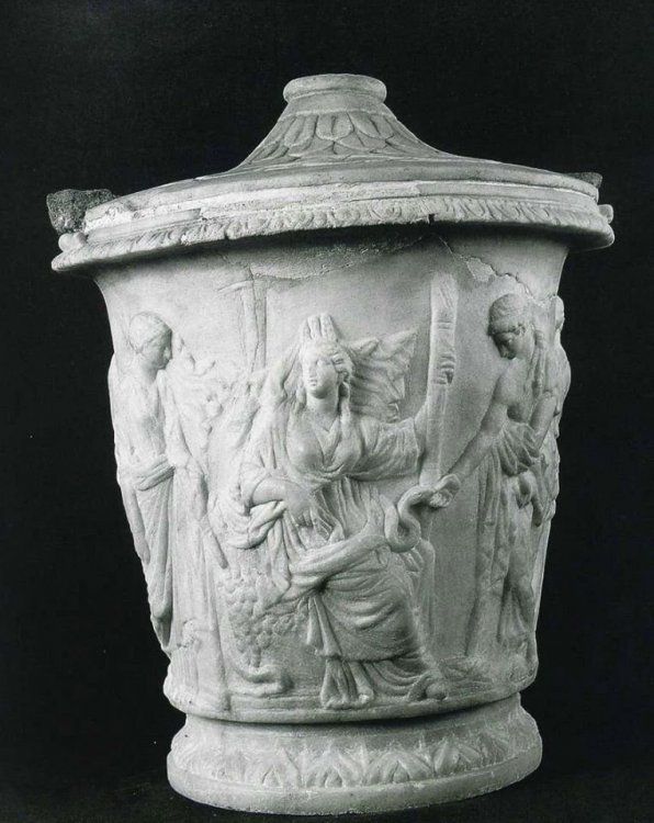 ILLUSTRAZIONE: Urna cineraria di marmo (urna Caetani Lovatelli), con coperchio, di epoca imperiale (terzo quarto I secolo a.C.), decorata a rilievo figurato con scene di iniziazione ai misteri eleusini. – h 31 cm d 32 cm - Sul corpo del vaso: Demetra, in trono, con accanto la figlia Kore in piedi che regge una fiaccola