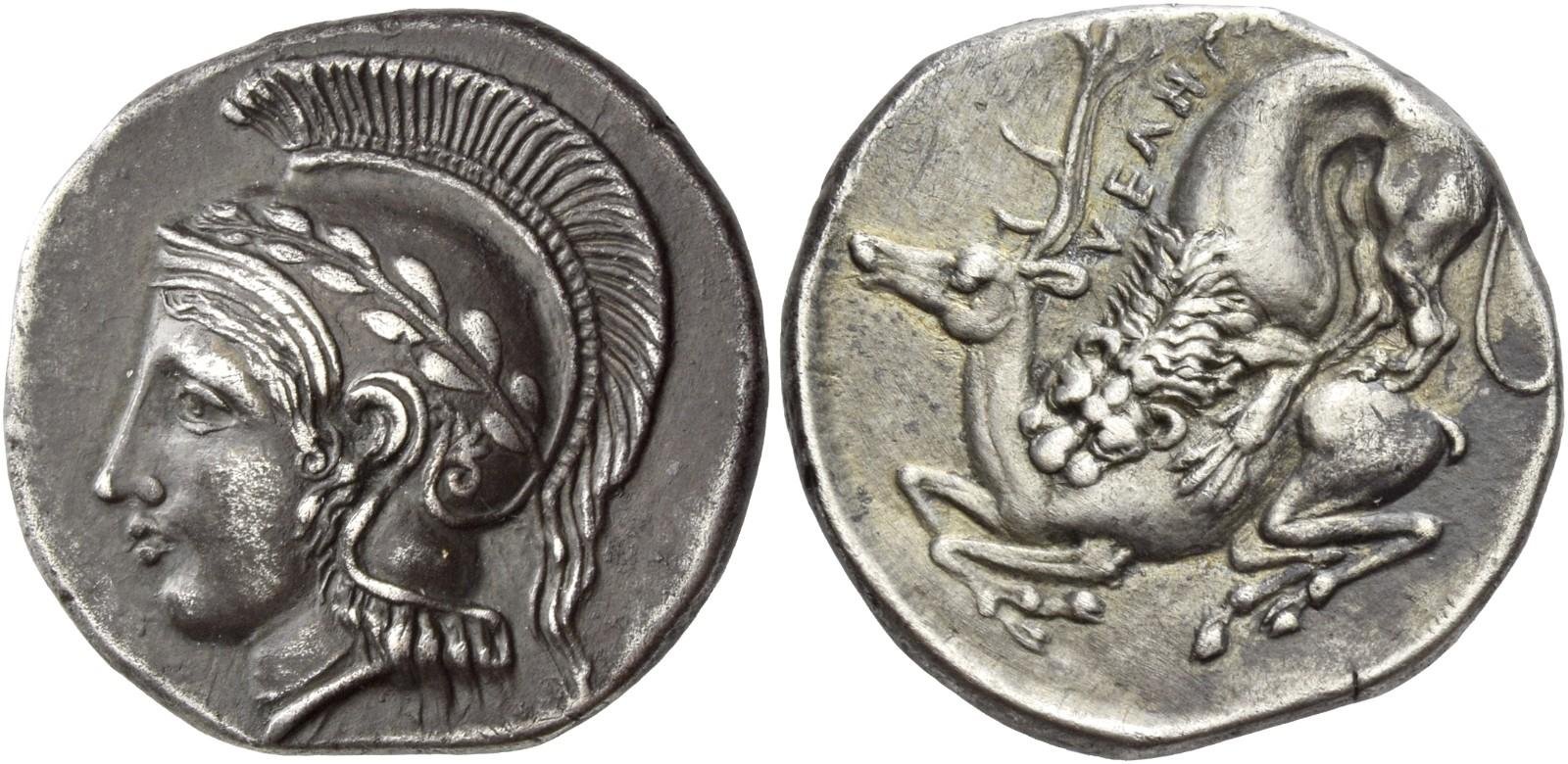 Ex Leu/M&M 28 May 1974, Kunstfreund, 181 and Morton & Eden 51, 2011, Exceptional Greek coins, 17 sales.As Velia was an original colony of Phokaia founded around 535 BC, its coinage regularly paid homage to its mother city through its types and weight standard down to the third century BC. Silver staters (nomoi) were struck to the Phokaic weight standard and, beginning in the fourth century BC, regularly featured the helmeted head of Athena on the obverse and a lion on the reverse. The depiction of Athena, including the griffin ornament on the bowl of her helmet, is derived from the obverse type used for Phokaian electrum hektai in the fifth century BC. The griffin was a popular civic badge of Phokaia. Likewise, the lion, particularly when shown devouring its prey was a staple type for early electrum issues of Phokaia in the late sixth and early fifth centuries BC.On the present stater, the usual stand-alone lion is shown in a dramatic scene attacking a hapless stag. This new image is ultimately derived from Near Eastern artistic traditions and can be found on coins struck by the fifth-century Phoenician kings of Kition on Cyprus, as well as on issues of Tarsos and Myriandros under the Persian satrap Mazaios (c. 361-334 BC). This ubiquitous Near Eastern motif entered the Greek iconographic repertoire during the Archaic period, as evidenced by numerous representations on painted pottery and in sculpture. The representation of the lion attacking the stag on Velian coins therefore probably comes from the use of the image in Greek art rather than direct exposure to the Near Eastern models. Still, it is notable that Velia is the only Greek city to employ this somewhat ubiquitous image as a coin type.The enduring popularity and influence of this Velian lion and stag type may be gauged by the fact that it was later resurrected to serve as the reverse type for a denarius issue of Augustus (RIC 318), perhaps serving to indicate the southern Italian origin of the responsible moneyer, M. Durmius.