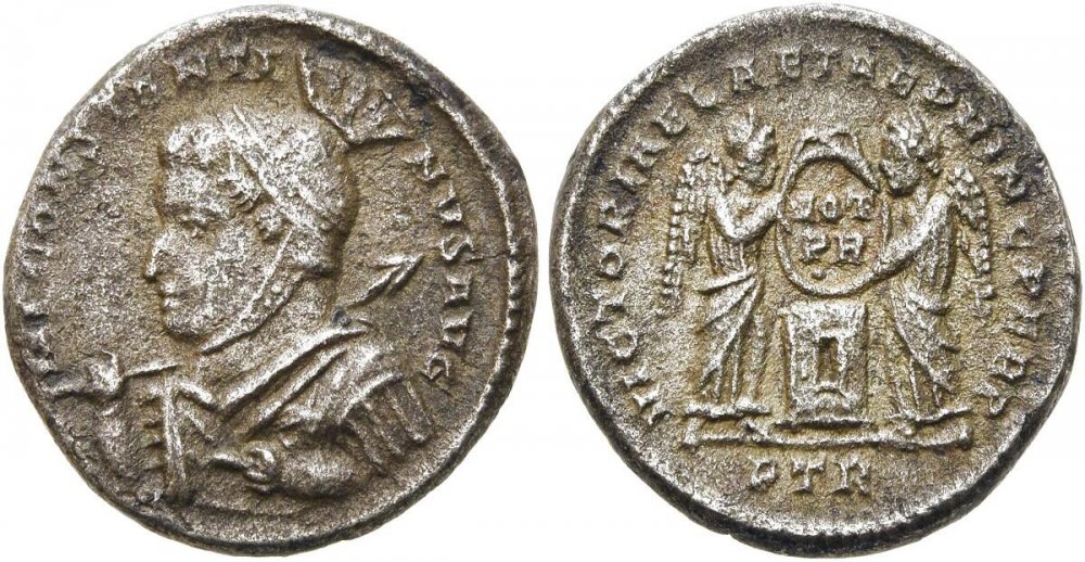 Constantin I., der Große, 307 - 337 n. Chr. AE Follis ø 17mm (3,41g). 318 - 319 n. Chr. Mzst. Treveris. Vs.: IMP CONSTANTI-NVS AVG, drapierte Panzerbüste mit Helm u. Lanze n. l. Rs.: VICTORIAE LAETAE PRINC PERP / PTR, zwei Viktorien halten einen Schild mit der Aufschrift VOT / PR über einen Altar. RIC VII, 208A. R! Tönung gutes ss