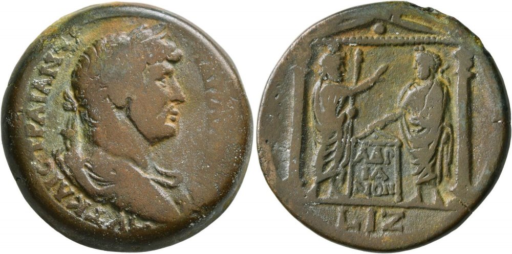 EGYPT. Alexandria. Hadrian, 117-138. Drachm (Bronze, 32 mm, 26.00 g, 12 h), RY 17 = 132/3. AYT KAIC TPAIAN AΔPIAN[OC C]ЄΒ Laureate, draped and cuirassed bust of Hadrian to right, seen from behind. Rev. L IZ Serapis, on the left, standing right, raising his right hand and holding scepter in his left, and Hadrian, on the right, standing front, head to left, holding scepter in his left hand and resting his right on stele inscribed ΑΔΡ/ΙΑ/NON, all within distyle temple. Dattari (Savio) 1945. Emmett 1042.17. K&G 32.553. RPC III 5844. Good fine.