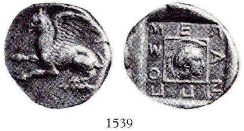 Dal vecchio manuale di Sear, un bel tetradrammo di Abdera di Tracia con al rovescio piccola testa elmata della dea guerriera Atena, in cartiglio contornato da nome di magistrato .
