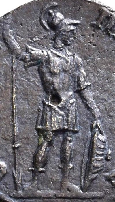 Dalla repubblica di Roma e dal rovescio di un raro denario al nome di L. Valerius Acisculus, un particolarissimo guerriero : un gufo o civetta con testa umana, con elmo corinzio ed armato/a con scudo rotondo e 2 giavellotti .