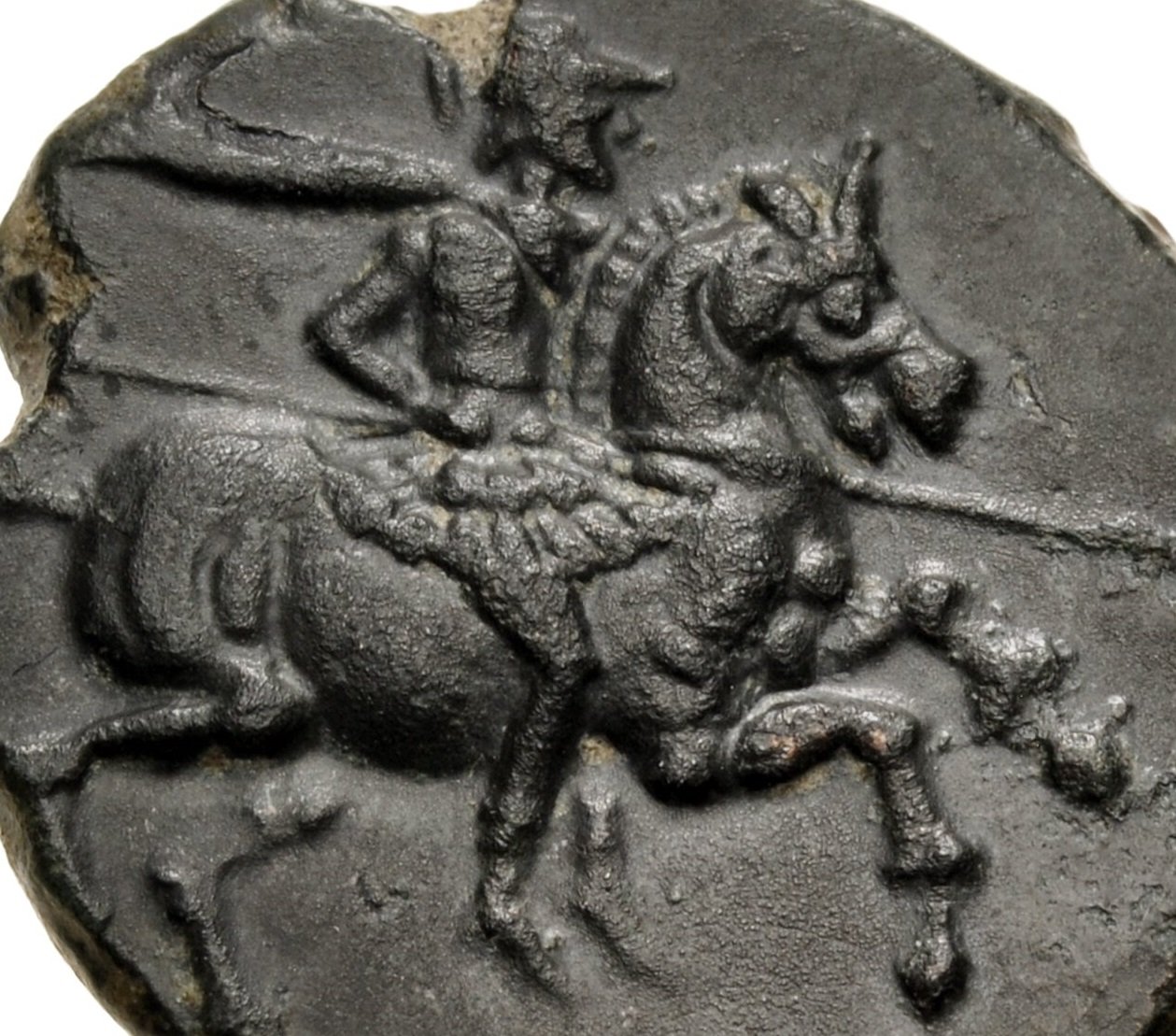 Da un accattivante, piccolo bronzo di Mesembria di Tracia, 2 importanti accessori per guerrieri : un elmo ed uno scudo ovale, questo rappresentato nella vista da interno .