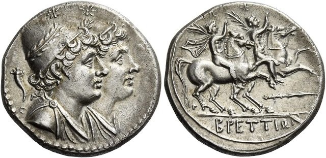 Hannibal on the Romans at Cannae (216 BC) they threw their support behind the Carthaginians. Bruttium became a stronghold for Hannibal and a staging area for Carthaginian attacks on neighbouring regions and the Brettii some of his staunchest allies in Italy. The Brettii remained loyal to Hannibal even after 204 BC, when his former conquests and allies in Italy had been lost. Alas, Hannibal was not nearly so supportive of his allies. When he was recalled to defend Carthage in the following year he completely abandoned the Brettii to face the wrath of Rome alone. The Romans duly punished their faithless allies by seizing much of the territory of Bruttium, refusing to grant the Brettii a new treaty of alliance (even a severely disadvantageous one) and by establishing colonies to keep a perpetual watch over them. Interestingly, while the Brettii made themselves the enemies of Rome in the Second Punic War, this didrachm illustrates the great economic and cultural influence that the Romans had on them. The coin was struck to a weight standard that has been considered to reflect the declining weight of the Roman quadrigatus silver denomination. This denomination was finally destroyed by the financial pressures of the Second Punic War and replaced by the new denarius denomination in c. 211 BC. Ironically, the Brettian didrachm also prominently features the Dioscuri, the twin saviour gods who were said to have fought alongside the Roman forces at the Battle of Lake Regillus (c. 496 BC) early in the history of the Republic. The Dioscuri on the reverse echo the type chosen for the new denarius denomination although here they are unarmed and holding palms while on the denarius they charge with couched lances. The depiction of the draped busts of Castor and Pollux on the obverse is probably one of the finest in ancient Greek numismatics and may perhaps lie behind a very similar draped image of a single Dioscurus used more than a century later when Rome's disgruntled Italian allies revolted and embarked upon the Social War (91-88 BC).
