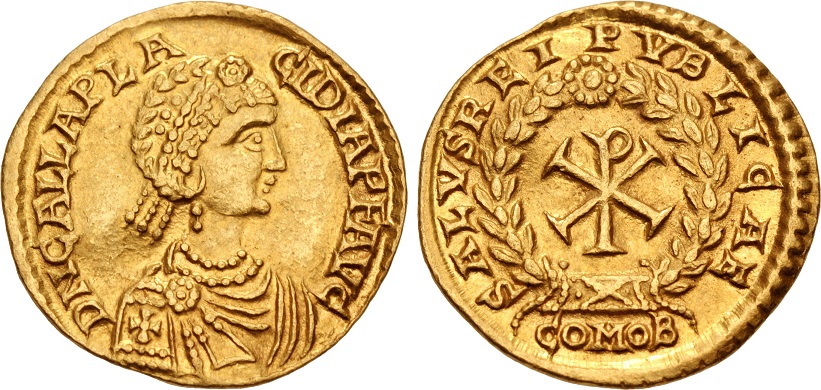 Galla Placidia. Augusta, AD 421-450. AV Semissis (16.5mm, 2.04 g, 6h). Ravenna (or Rome) mint. Struck AD 440-455. Pearl-diademed and draped bust right / Christogram within wreath with large central jewel; COMOB. RIC X 2054 (Rome and/or Ravenna); Ranieri 79 (Ravenna); Depeyrot 47/5 (Rome). Slight wave in flan. Near EF. Very rare.