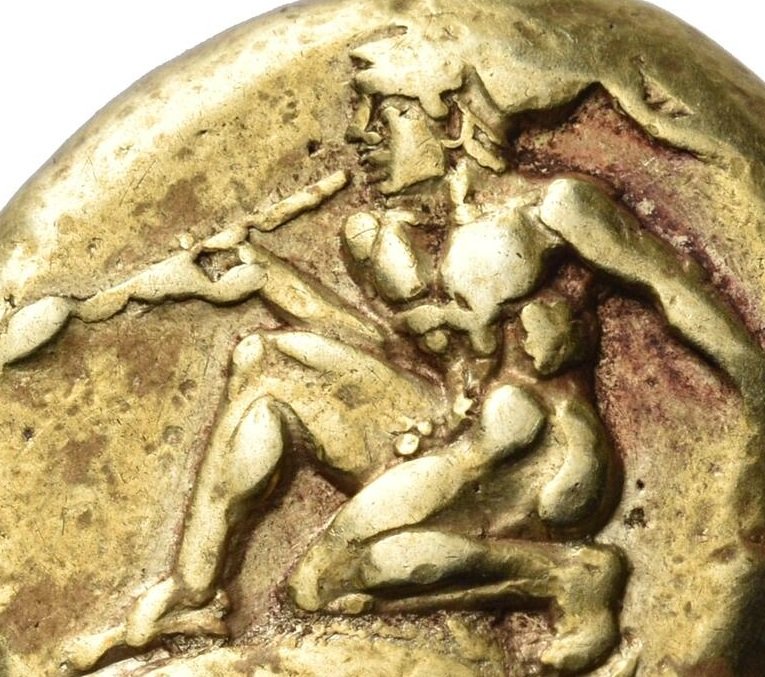 Stater circa 450-400, EL 22 mm, 15.95 g. Naked warrior, kneeling r., wearing a helmet and holding a weapon and a shield. Rev. Quadripartite incuse square, with granular surfaces. von Fritze 211 and pl. VI, 23 (this coin). Jameson 2569 (this coin). Gulbenkian 670 (this obverse die). Of the highest rarity, possibly only two specimens known. A very interesting representation struck on a full flan. Very fine