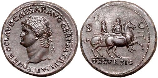 RÖMISCHES REICH, Nero, 54-68, AE Sesterz, Rom. Belorb. Büste l., NERO CLAVD CAESAR AVG GER PM TRP IMP PP. Rs.Nero r. reitend, hält eingelegte Lanze, dahinter Soldat mit Vexillum r. reitend, DEVCRSIO, S-C. 24,67g.