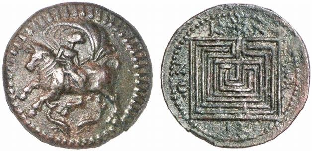 The earliest coinage of Crete was struck much later than its appearance would suggest. This stater, for example, looks very much like a product from the Archaic period, yet archaeological and hoard data shows it was struck well into the Classical period – at least half a century later than its style and fabric would suggest. The relative isolation of Crete assured that in many other ways, such as forms of speech, it also developed more slowly than most other Greek lands. Crete had yet another interesting consideration for its coinage, namely that it relied upon imported coins for its silver; thus, this coin was probably overstruck on a stater of Aegina, the coinage that most frequently reached the island before about 330 B.C. This coin is one of the earliest from Cnossus, a city on the northern coast of the island. Not surprisingly, its designs derive from the city’s most famous mythological episode, the Minotaur in the labyrinth. The Minotaur had the body of a man and the head of a bull – a predictable composition for a creature born of an intimate encounter between a bull and Pasiphae, the wife of the Cretan king Minos. (Oddly enough, Suetonius tells us Pasiphae was claimed as an ancestress by the emperor Galba). The Minotaur was kept by Minos in a specially constructed labyrinth at Cnossus and was fed with condemned criminals, maidens and young boys sent from Athens as tribute to the Cretan king. It has been noted that the Phoenician Baal Moloch shared the form of the Minotaur and likewise fed on human sacrifice victims.