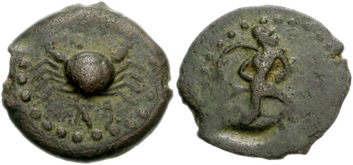 ISLANDS of SICILY. Lopadusa(?). 3rd century BC. Æ 19mm (3.35 g, 6h). Crab; Punic 'MB' below / Warrior advancing right, holding shield and spear. Calciati III 4; SNG Copenhagen 475. VF, dark green-brown patina. Rare.