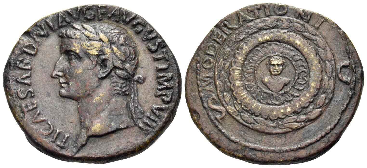 Tiberius, 14-37. Dupondius (Orichalcum, 31 mm, 15.91 g, 12 h), Rome, 16-22. TI CAESAR DIVI AVG F AVGVST IMP VIII Laureate head of Tiberius to left. Rev. MODERATIONI / S C Small bare headed facing bust of Tiberius within round medallion surrounded by two rings of petals; all within laurel wreath and set on shield. BMC 90. Cohen 5. RIC 39. Very rare. Smoothed; some light tooling, otherwise, very fine.