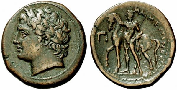 Litra in bronzo (9,44 g) coniata a Messana (Sicilia) tra il 310 ed il 288 a.C.  D.: Testa della ninfa Peloria con corona d’orzo a sinistra; davanti ad essa due delfini; legenda PELORIAS. R: Feraimone che avanza nudo verso sinistra proteggendosi dietro ad un grande scudo rotondo ed impugnando la lancia; legenda: MESSANIWN., “(moneta) dei cittadini di Messana”.