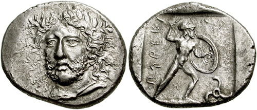 Head of Persephone right, wearing wreath of grain ears, single-pendant earring, and pearl necklace / Ajax advancing right, nude but for crested Corinthian helmet, holding sword in right hand, shield decorated with coiled serpent on left arm; kantharos below.