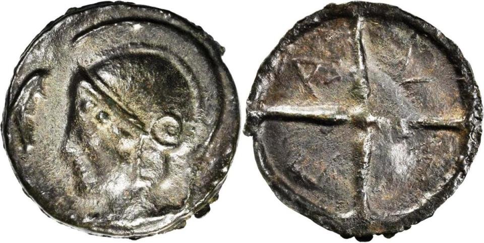Rappresentati i due dei guerrieri  : al diritto testa elmata di Ares , al rovescio Atena con elmo, scudo, lancia, indossante lunga veste .