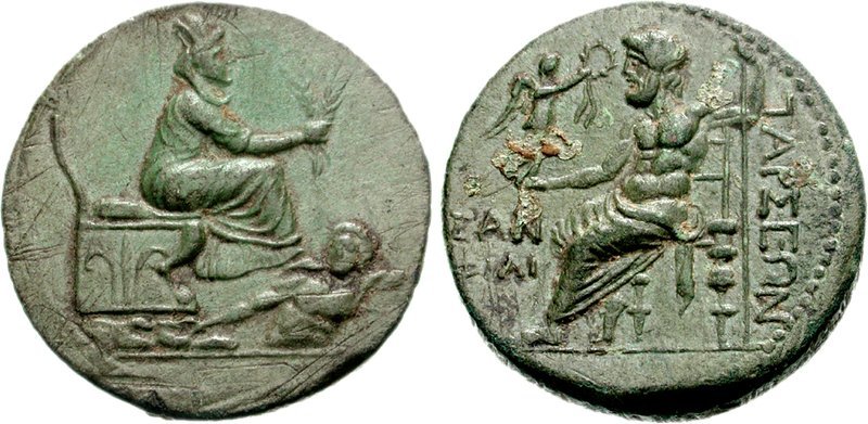 CILICIA, Tarsos. 164-27 BC. Æ 26mm (14.93 g, 12h). San- and Phili-, magistrates. Tyche, turreted and veiled, holding grain ears in extended right hand, seated right on throne, right foot on the shoulder of the river god Orontes, who swims right below / TARSEWN, Zeus Nikephoros seated left; SAN/FILI in two lines to left. Cf. SNG France 1374; SNG Levante 979-80 var. (magistrates); SNG Copenhagen -; SNG von Aulock -; BMC -. Near EF, exceptional olive green patina, light adjustment marks on obverse, a couple spots of encrustation on reverse.