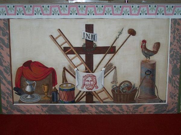 Paliotto settecentesco con gli strumenti della passione di Gesù conservato presso il Santuario di Corbetta (MI): oltre alla croce col titulus crucis, vi si riconoscono (da sinistra a destra) la tunica di Cristo, il guanto che colpì Gesù durante la derisione da parte dei soldati, la brocca per l'acqua usata da Pilato per il lavaggio delle mani, il calice dell'Ultima Cena, il contenitore della mirra usata da Nicodemo per ungere il corpo di Gesù dopo la deposizione, un tamburo e i dadi usati dai soldati per tirare a sorte la tunica, il flagello, fruste di saggina, la scala, il sudario col volto di Cristo, la corona di spine, la lancia del centurione, la spugna imbevuta di aceto, un cesto coi tre chiodi della crocifissione, martello e tenaglia, la colonna della flagellazione ed il gallo che cantò per il rinnegamento di san Pietro.
