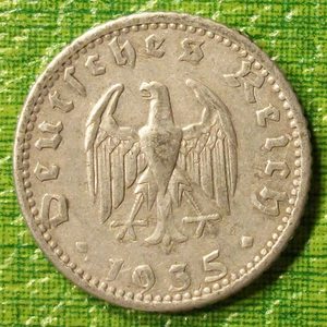 La Germania era sempre più inquieta come 1930 pianificatori progrediti di nazis--ememore del crunch metalli strategici sperimentato durante la grande guerra—causato alluminio 50-reichspfennig monete essere colpito e stoccate per un'emergenza che potrebbe richiedere il recupero improvviso della monetazione nichel 50-reichspfennig. Ecco un esempio di Stoccarda-zecca del tipo alluminio 1935, che rimase in deposito per alcuni anni prima il suo circulazione: