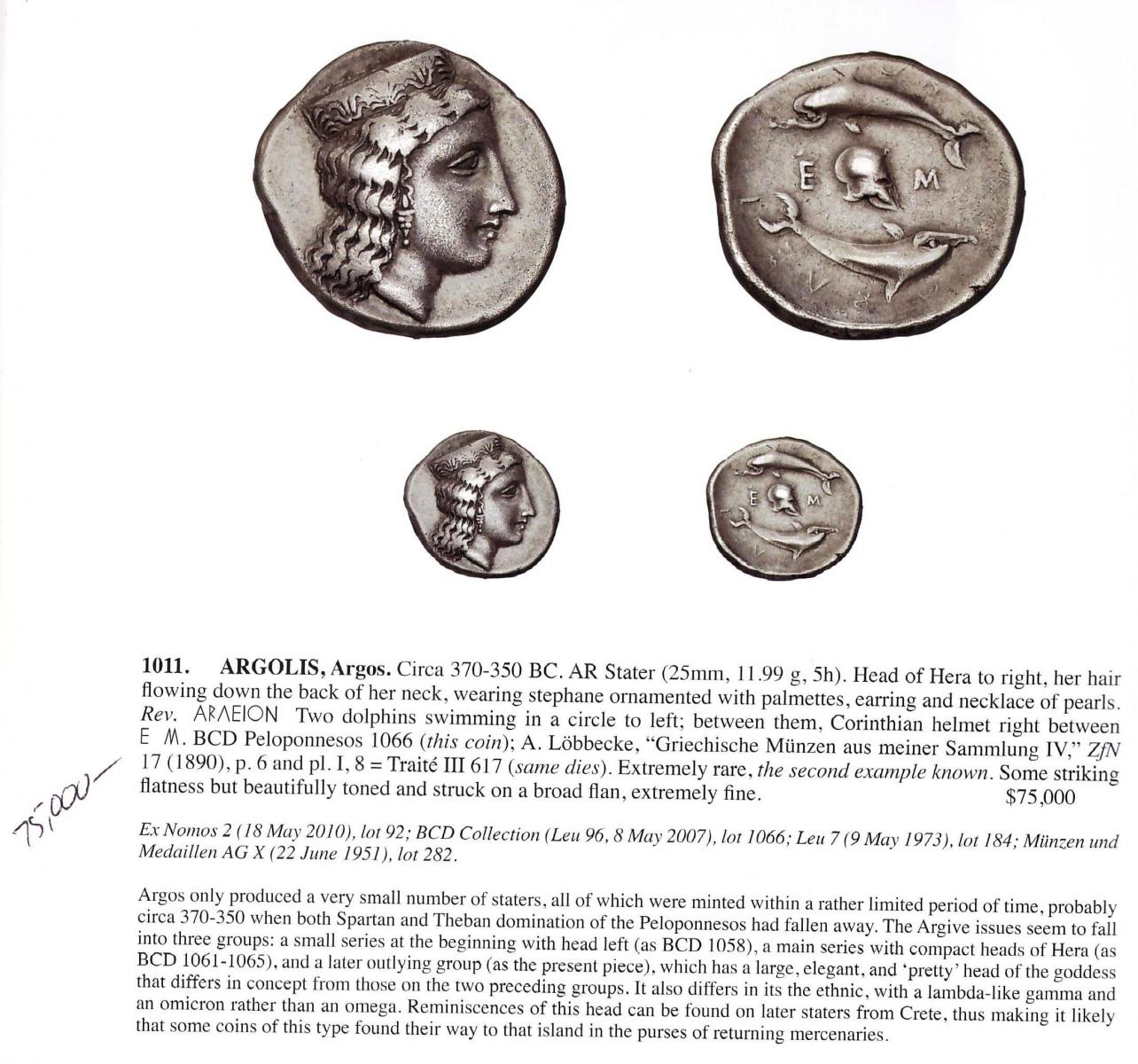 Lo statere di Argo è moneta molto bella : come quella con elmo corinzio invece che lupo , tra i delfini , dalla vendita "Masterpieces  / selections from cabinet W " , vendita del 04-01-2012 , allora piuttosto discussa soprattutto per il decadramma di Agrigento