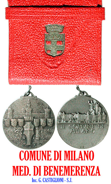 R.   AI BENEMERITI DELLA CROCE ROSSA ITALIANA  Nel centro in alto stella raggiante con sotto entro rami di palma, alloro e quercia, aquila sabauda coronata, con ali spiegate, su cartiglio entro cui stemma sabaudo. In basso nastro su cui: INTER. ARMA CHARITAS In piccolo: JOHNSON-MILANO.
