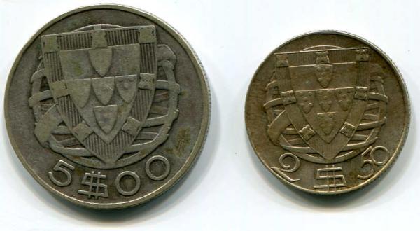 Portogallo 2,50 Escudos 1944 e 5 Escudos 1948 - Argento .650