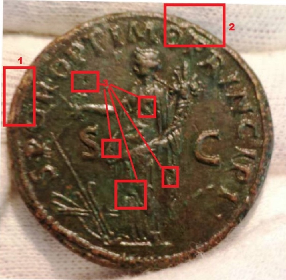 Sul rovescio :1 sul bordo si notano evidenti punti , dove si intravvede il metallo nudo. 2 , la continuità del perlinato non è continua , anzi si interrompe , per poi riprendere fuori il diametro del perlinato che arriva da sinistra.con 3 ho evidenziato solo alcuni crateri di depressione da fusione.