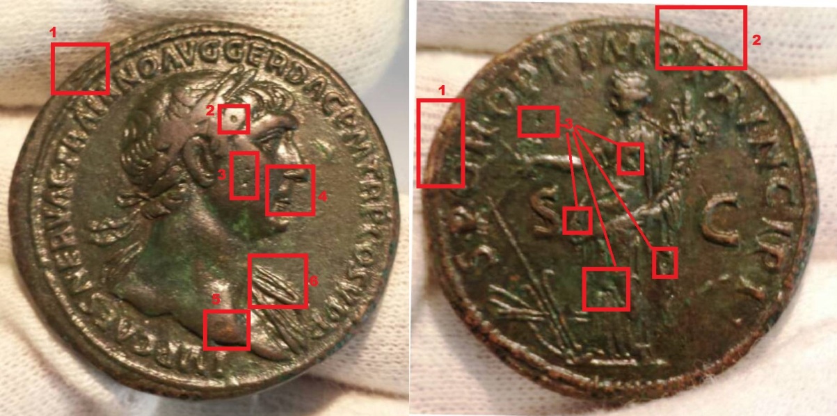 Ti elenco e ti illustro alcuni dettagli che fanno desumere che il sesterzio di Traiano da te postato "potrebbe " essere un falso a microfusione ripatinato. Scrivo potrebbe al condizionale poiché sto analizzando una foto da te postata e se avessi chiesto prima di acquistarlo , ti avrei consigliato di lasciar perdere. Certamente dalle foto quando sono ad alta risoluzione , si può dare un giudizio molto più sicuro. Pertanto io illustro i punto negativi e poi lascio spazio a commenti di altri utenti senza polemicare.