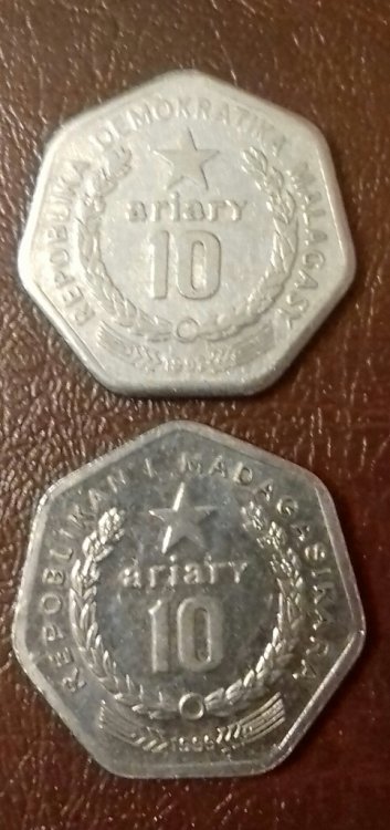 Madagascar: 10 Ariary 1992 (Repoblika Demokratika Malagasy) e 1999 (Repoblikan'i Madagasikara).