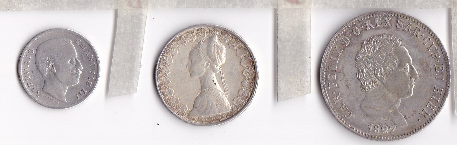 2- argento 835 la lira 1907 e le 500 lire; la 5 lire 1827 argento 900 e pesa 25 grammi