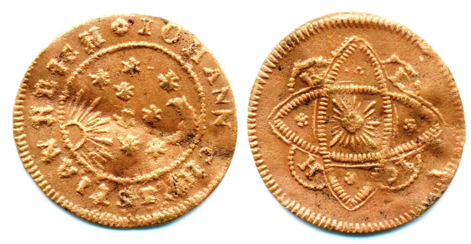 Rechenpfennig di Norimberga: ottone (peso ca 0,8-0,9 g, diametro ca 20 mm), data tra 1768 e 1814.