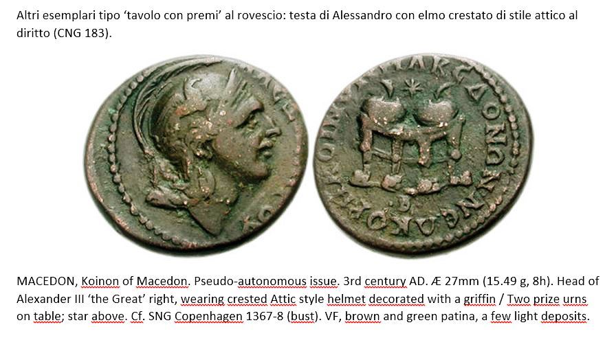 Macedonia sotto la dominazione romana, Koinon di Macedonia. 3° sec. d. C. Æ 26 mm, 13,56 g. D/ Testa diademata di Alessandro AΛEXANΔΡOY / KOINON MAKEDONWN B NE, tavolo sormontato da due urne premio, ciascuna contenente un rametto di palma; un vaso sotto il tavolo. AMNG 611.