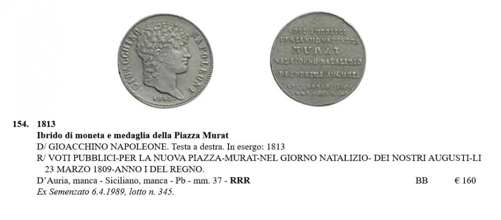 Grazie a tutti per i vostri commenti e le considerazioni che avete espresso in merito a questa particolarità. Inizio subito dicendo che questo esemplare, così come l'altro dell'asta Varesi, com'è stato giustamente fatto notare da @Michelangelo2, potrebbe considerarsi come inedito in quanto manca in tutti i repertori principali di medaglistica partenopea. Interessante il quesito di @providentiaoptimiprincipis che chiede, sostanzialmente, il perché ci ritroviamo questa medaglia col conio di D/ di una moneta e per giunta con due date diverse. Come ho già spiegato nei miei precedenti messaggi, secondo me, questo raro ibrido è stato coniato nel 1813 (o poco dopo). A livello storico, il 16 gennaio 1813 Murat lascia l'armata napoleonica, in ritirata dalla disastrosa spedizione in Russia, per fare ritorno in tutta fretta a Napoli. Per questo avvenimento ci sono state tramandate due medaglie: 1) http://numismatica-italiana.lamoneta.it/moneta/W-ME52E/5 e 2) http://numismatica-italiana.lamoneta.it/moneta/W-ME52E/6 Al suo rientro a Napoli, Murat si diede da fare per migliorare alcuni aspetti urbanistici della città: sempre nel 1813, egli diede il via ad un piano regolatore che ordinasse un'espansione edilizia in senso moderno della sua città. Forse, il nostro ibrido riguarda proprio questo avvenimento: come nel 1809 venne completata la Piazza antistante il Palazzo Reale grazie agli sforzi di Murat, così nel 1813, al suo ritorno dalla Russia, lo stesso Murat incrementò l'espansione edilizia in modo ordinato, accrescendo la città di Napoli sotto vari punti di vista. Questo spiegherebbe anche il perché delle due date 1809 (l'opera edilizia della Piazza prima della partenza) e del 1813 (la continuazione ideale di quel progetto iniziato tanti anni prima). La data 1813 commemorerebbe quindi questo secondo impegno urbanistico di Murat, come una continuazione ideale del primo, quello della Piazza. Invece di incidere nuovi conii per una medaglia, può essere che abbiano usato quello di una moneta recante questa data, in modo da risparmiare sui costi di produzione: incidere il conio per una nuova medaglia, infatti, era molto più costoso rispetto alla commissione di un conio per moneta. Ciò sarebbe confermato dal fatto che i conii utilizzati siano quelli ufficiali e che quindi questo ibrido fosse stato prodotto in maniera "regolare" dall'autorità emittente di quel periodo. Per questo tenderei a scartare l'ipotesi di una committenza privata. Vediamo ugualmente se ci sono altri pareri: questa discussione si sta facendo davvero molto interessante soprattutto grazie ai vostri contributi e a @palpi62 che ci ha dato l'occasione di disquisire su questo pezzo particolare (mi scuso se non sono riuscito a citare più di una persona, ma attualmente il sistema non me lo consente :D ).
