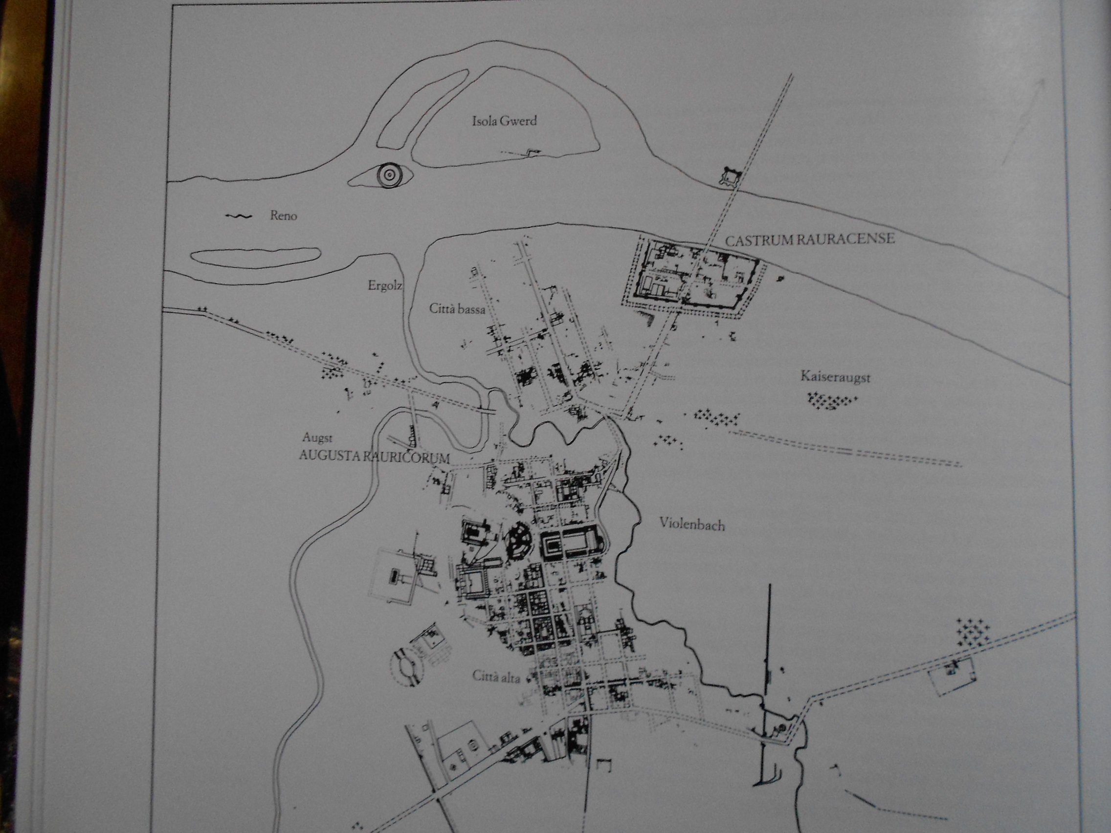Augusta Raurica e’ oggi un importante e grande sito archeologico romano ubicato nel Nord della Svizzera , situato a quasi 20 km ad est di Basilea , che corrisponde all’ attuale piccolo Comune di Augst o Kaiseraugst . Augusta Raurica e’ la più antica colonia romana sul Reno , fu infatti fondata da Giulio Cesare in prossimita’ del Reno . Augusta Raurica venne fondata nel 44 a.C. da Lucio Munazio Planco , luogotenente di Giulio Cesare nel corso della guerra gallica , era situata in un territorio occupato da una locale tribù gallica chiamata Raurica . Solo al tempo di Augusto si consolido’ la conquista di tutta l’ area alpina e la primitiva colonia cesariana prese il nome di Colonia Paterna Pia Apollinaris Augusta Emerita Raurica , probabilmente per aver ospitato la Legione XV Apollinaris fondata da Giulio Cesare proprio in occasione della guerra gallica ,Legione nota fino al V secolo . Vespasiano e poi Domiziano partirono da qui per la conquista degli Agri Decumates , pericoloso cuneo territoriale germanico che si spingeva all’ interno della linea difensiva romana del Reno . Durante i primi due secoli dopo Cristo fu una colonia ricca e popolosa , capitale della locale Provincia romana . Gli Alemanni distrussero la Città nel corso della grande crisi del III secolo , circa nell’ anno 260 . Al tempo di Diocleziano venne qui rafforzata la frontiera germanica con la costruzione di un Ponte stabile fisso presidiato sulla sponda germanica da una testa di ponte fortificata in pietra , di forma quadrata di circa 45 metri per lato , la Colonia divenne il quartier generale della Legione I Martia , preposta anche alla difesa del Ponte . Successivamente nel tardo impero da qui’ partirono Legioni per le guerre civili e per le spedizioni punitive romane contro le incursioni delle tribu’ germaniche all’ interno del Limes . Sempre nel corso del tardo impero essa perse la sua primitiva importanza a favore del vicino insediamento celtico di Basilea , di cui non si conosce il primitivo nome , che diventera’ Castrum Rauracense ; gli abitanti sopravvissuti all’ invasione germanica degli Alemanni si posero sotto la protezione del Castrum Rauracense , un grande castello romano sito nella vicina Kaiseraugst e posto da ora in poi a difesa del Limes germanico tardo imperiale .