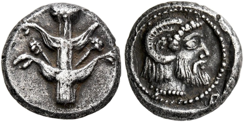 This extraordinary coin is one of great interest, and is hitherto unknown. It comes from a collection, or, rather, an accumulation, of coins and objects that left Libya in 1969 when King Idris I was deposed and foreign residents expelled from the country. Since that time it remained unstudied and in storage. The lack of an ethnic, while not uncommon with the early coinage of Kyrene, is particularly dismaying for this coin, since without one its attribution will always remain slightly in doubt. However, the types it bears provide good evidence for its origin. The obverse shows a ram’s head: this could well actually be a rhyton, as found on the contemporary tridachms from Delphi (which were very probably designed for trade with nearby Egypt); in any case, the ram’s head was only used as a type in Barke. This is understandable since Barke was inland and stock raising would have been a major part of the economy. A known didrachm from Barke (BMC 2 = pl. xxxiii, 3) has an obverse that closely parallels this one: on it we see the forepart of a bull paired with a silphium fruit. The reverse is, however, unlike anything from either Barke or Kyrene. It shows a silphium fruit with two dolphins swimming around it, an exact parallel to the way dolphins appear on the coinage of Syracuse, swimming around the head of Arethusa. At Syracuse they appear as a symbol of the sea water that surrounded the island of Ortygia, where Arethusa’s fountain bubbled up. Such a type seems unexpected for a landlocked city like Barke, but would be most appropriate for the coastal port city of Euhesperides. Thus, the possibility that this coin could be recording an alliance of friendship between the two cities is not at all unlikely.