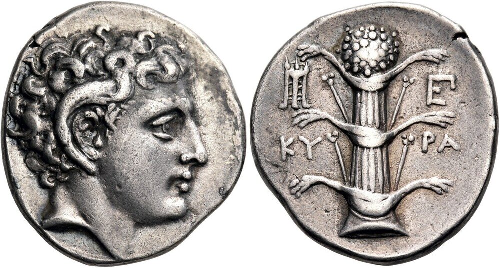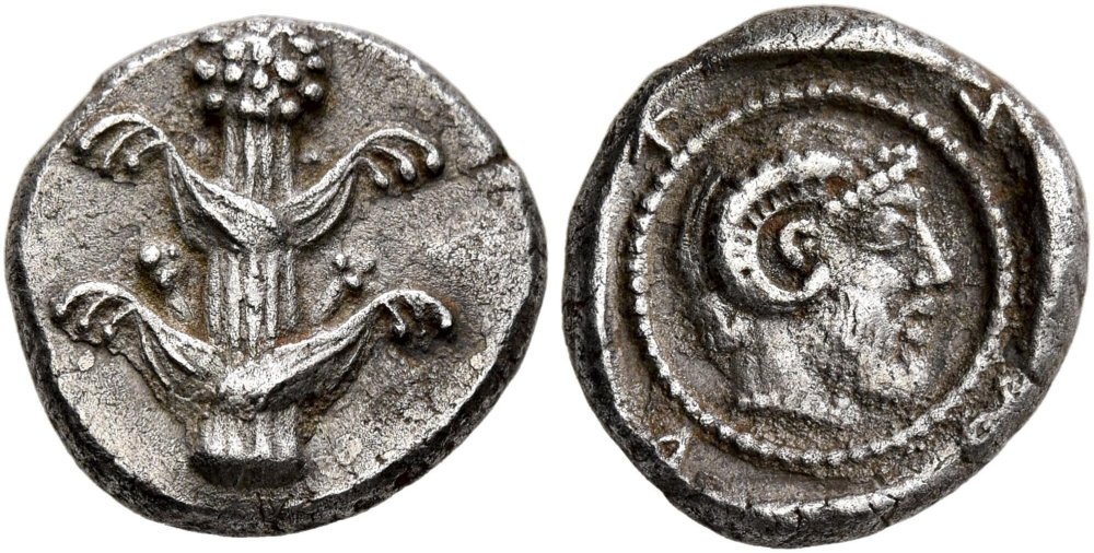 Die Signatur AKE der Rückseite lässt sich mit größter Wahr­schein­lich­keit mit dem Beamten (?) AKESIOS verbinden, von dem wir aus Barke mit vollem Namen signierte Tetradrachmen kennen, die einen Zeus Ammon-Kopf en face zeigen, ebenfalls Meisterwerke von hohem künstlerischem Niveau, s. BMC Cyrenaica Tf. XXXVI,8-9 (S. 101,32-32) und Tf. XLVII,5-8 (Seiten clxxvi-clxxvii,31a/b- 32a/b).