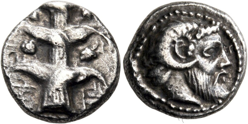 Certo bisogna considerare comunque che il delfino è una tipologia che ricorre molto sovente sulle emissioni delle più disparate zecche greche di ogni epoca, però siamo alla fine del periodo arcaico ed in quel range temporale a Thera (odierna Santorini) si coniavamo stateri con due delfini al dritto come in questo link all'esemplare NAC 78/274: