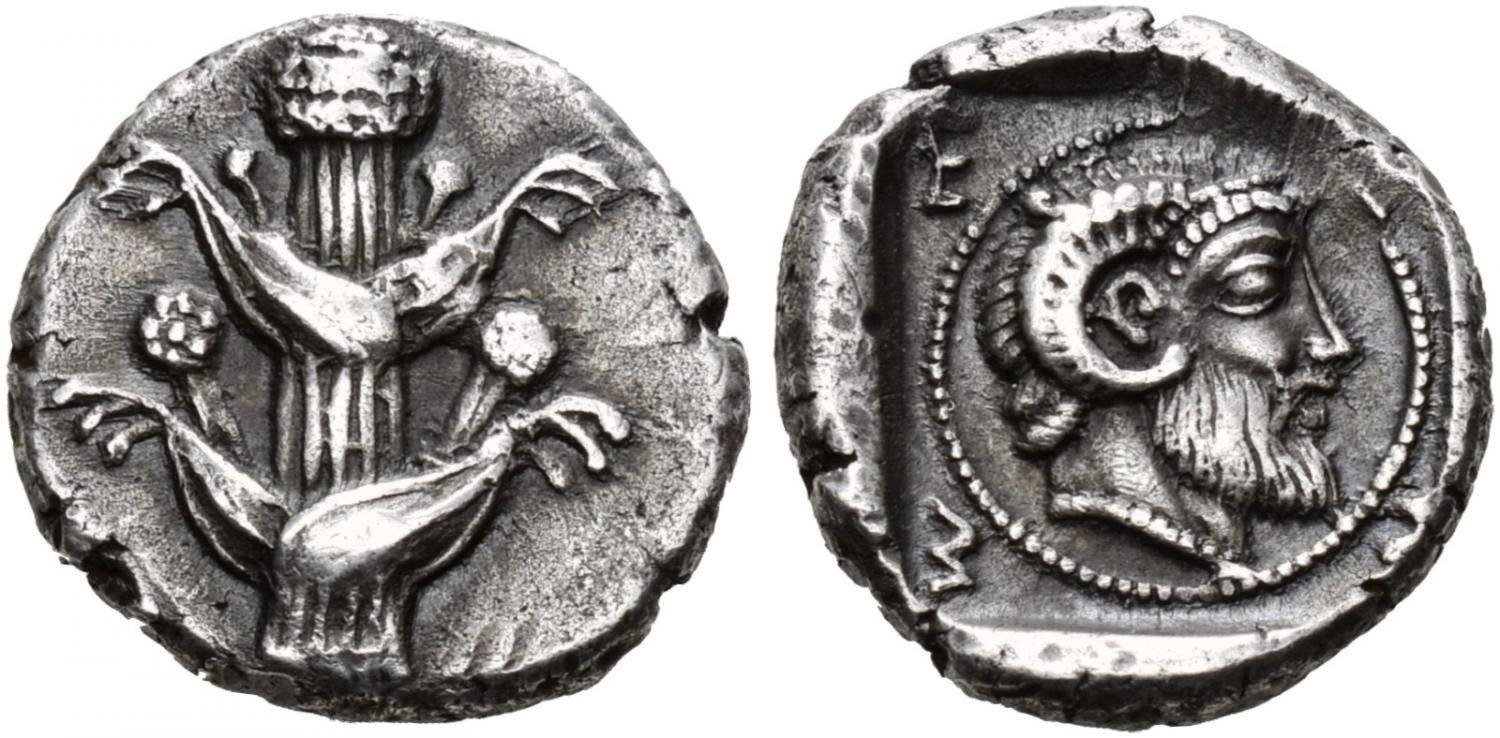 E’ attribuito alla zecca di Barce, città della Libia in Cirenaica (od. Al Marj) fondata nel 6° sec. da coloni di Cirene. Sottoposta al dominio persiano e autonoma dal 5° sec., contrastò il predominio cartaginese sul mare. Fu espugnata da Alessandro Magno nel 331 a. C. e passò ai Tolomei d’Egitto e quindi ai Romani.