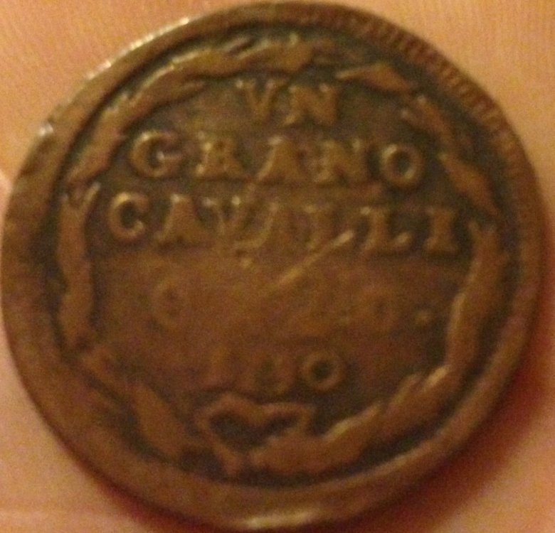 Ciao @Maximo84Maximo, la tua monetina...un grano cavalli 1790..lettere C/C, è di bassa conservazione ma considera che queste monete erano gli spiccioli del tempo, quindi circolarono tantissimo, è un millesimo comune e il suo valore è basso come la sua......conservazione.
