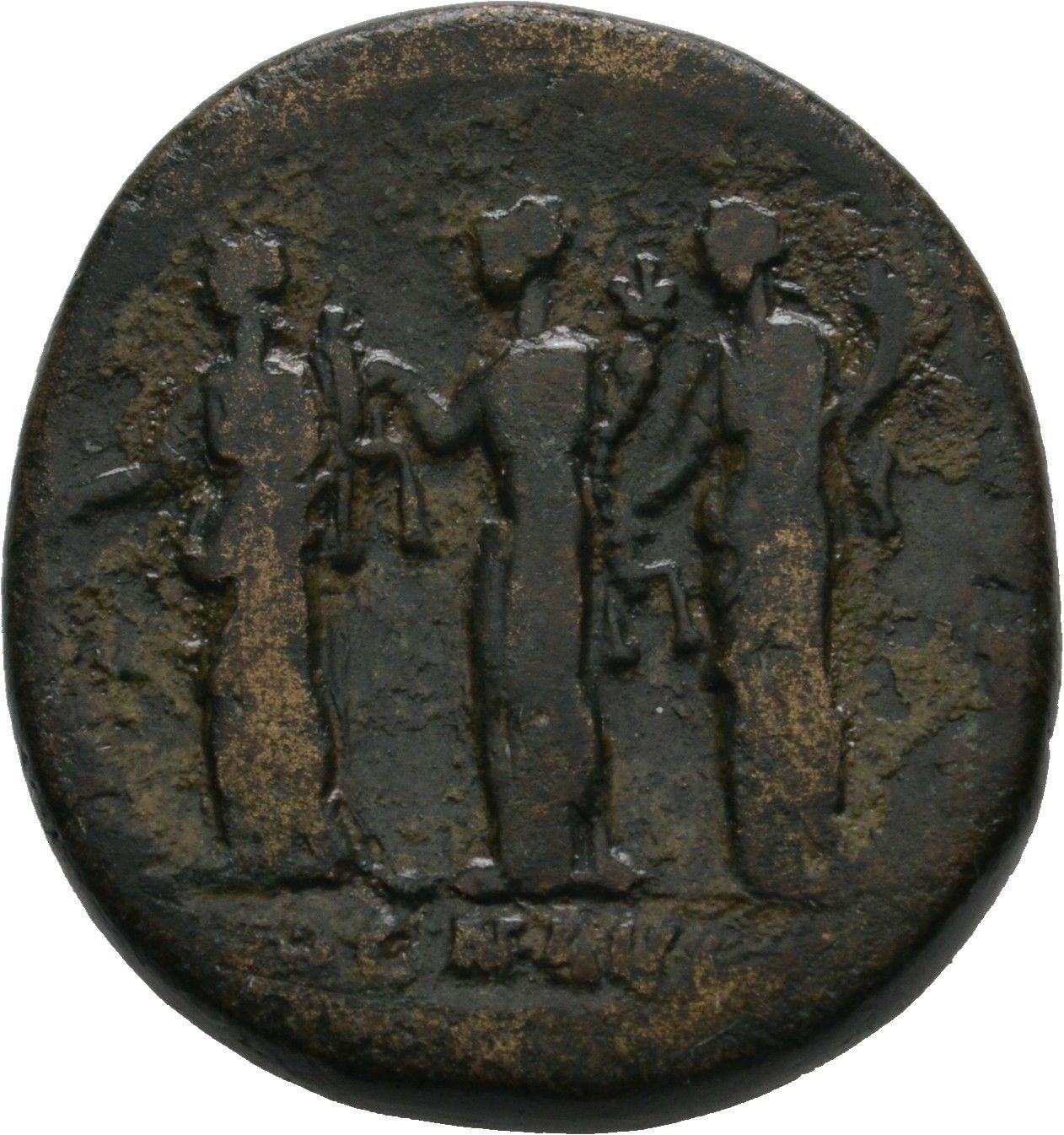 Le tre Monetae rivolte a sinistra, ciascuna con una bilancia e una cornucopia.