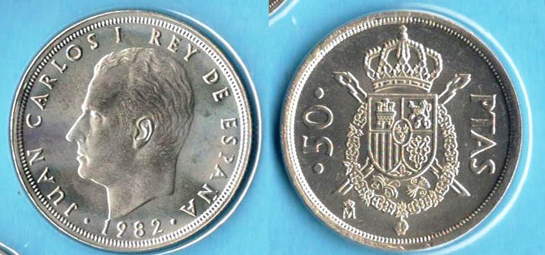 La raffigurazione sul diritto delle sei monete della mia serie è il ritratto di profilo a sinistra del re Juan Carlos I, con la scritta JUAN CARLOS I REY DE ESPAÑA / 1982. Il rovescio è invece caratteristico di ogni moneta.