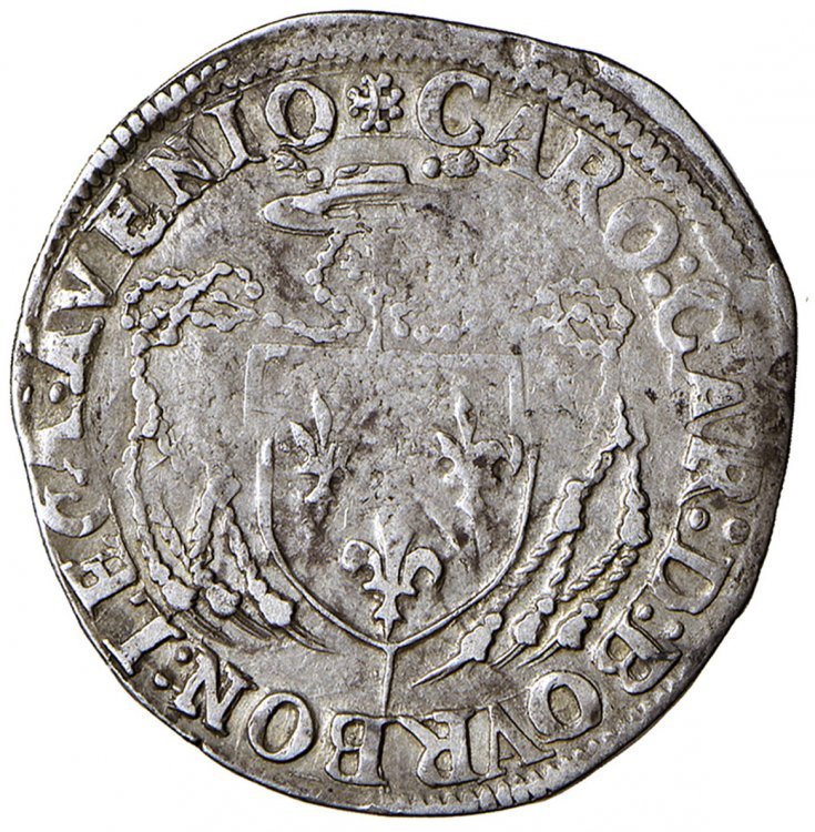 R/: Stemma cardinalizio semiovale (Card. Carlo de Bourbon-Conti, legato) + CARO : CAR : D : BOURBON : LEGA : AVENIO