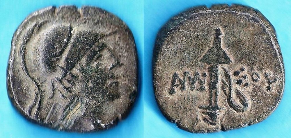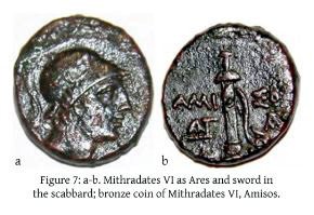In fig. 7 è riportato il bronzo che raffigura la testa elmata di Ares (come Mitridate VI) sul dritto e la spada (di Ares) nel suo fodero sul rovescio, dove compaiono spesso monogrammi e simboli.