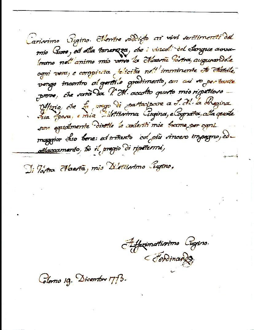 Carissimo Cugino. Mentre soddisfo ai vivi sentimenti del mio Cuore, ed alla tenerezza, che i vincoli del Sangue avvalorano nell'animo mio verso la Maestà Vostra, augurandole ogni vera, e compiuta felicità nell'imminente Sto. Natale, vengo incontro al gentile gradimento, con cui so per tante prove, che sarà da V.M. accolto questo mio rispettoso uffizio, che La prego di partecipare a S.M. la Regina Sua Sposa, e mia Dilettissima Cugina, e Cognata, alla quale sono egualmente dirette le ardenti mie brame per ogni maggior Suo bene: ed intanto col più sincero impegno, ed attaccamento, ho il pregio di ripetermi, Di Vostra Maestà, mio Dilettissimo Cugino,