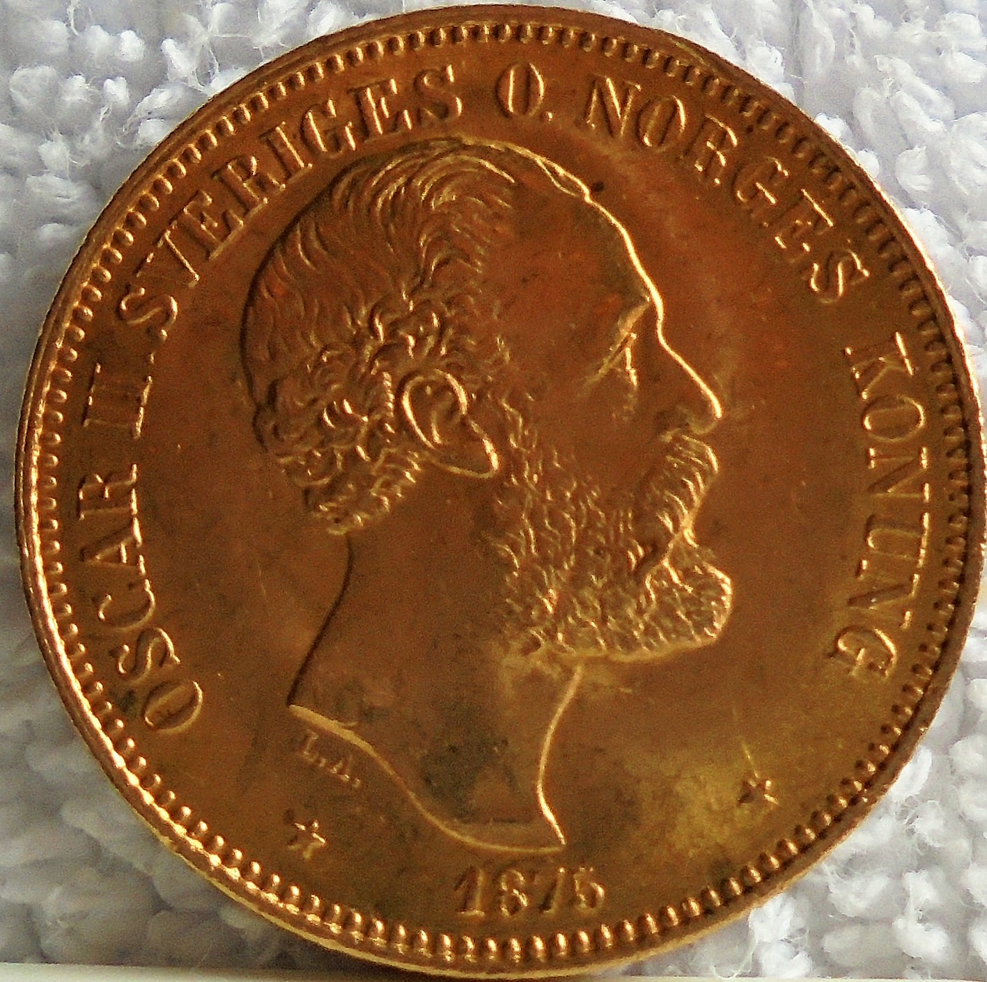 facendo pratica nel fotografare le mie monete, mi è capitata questa 20 corone (Kronor) svedesi del 1875, Oscar II re di Svezia e Norvegia, che posto.