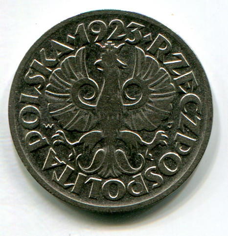 Per questa biglietto da 5 groszy del 1924/25, è stata usata mezza banconota da 10.000.000 di Marek del 1923, è stato poi sovrastampato per riadeguarlo al nuovo valore.
